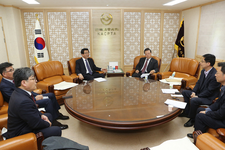 President Won Kyeong Hei spoke with Lee Myung-kyu, head of the National Tax Service's Income Tax Bureau, during his visit to the KACPTA hall on April 14. Lee Myung-kyu explained the progress of the National Tax Service's "report on the original deduction for student(ICL) repayment after employment" and asked for cooperation from the Korean tax community. "We will make sure that the KACPTA cooperates if there is anything to help running the system," president Won said.